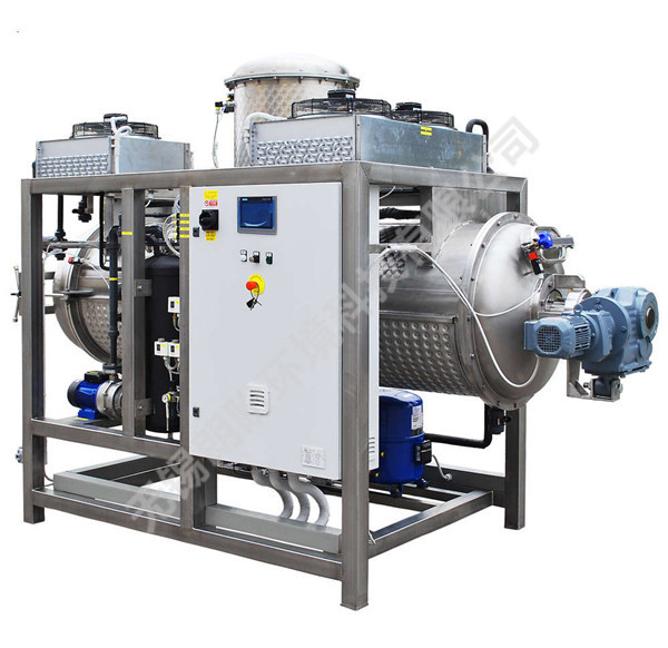 本公司低溫熱泵結晶器通過壓縮機作用于冷媒,獲得高溫高壓工質氣體,經過冷凝器工質氣體放熱液化,冷卻得到工質液體,同時將熱量傳給了物料,使物料中的水分汽化,與物料分離,在蒸發(fā)器頂部經冷凝成冷卻水通過冷凝水排水裝置排出,冷凝后的工質液體通過減壓再次氣化,在蒸發(fā)器中吸收由物料中的水分汽化產生的水蒸汽的熱量,經壓縮機的吸入再壓縮,如此循環(huán)工作。